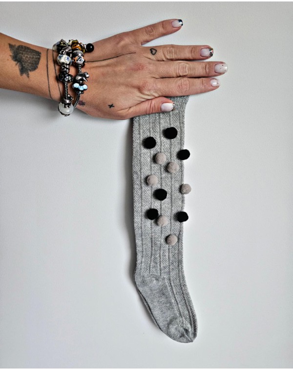 Pilkos kojinės iki kelių dekoruotos juodais ir pilkais pūkučiais