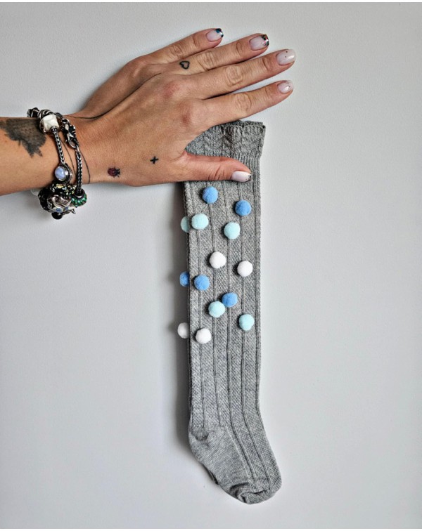 Pilkos kojinės iki kelių dekoruotos melsvais ir baltais pūkučiais