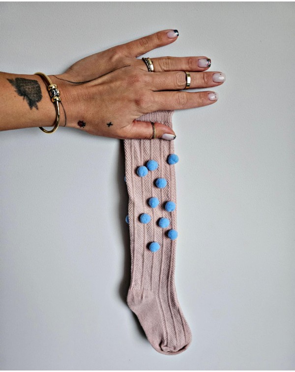 Rausvos kojinės iki kelių dekoruotos baby blue pūkučiais