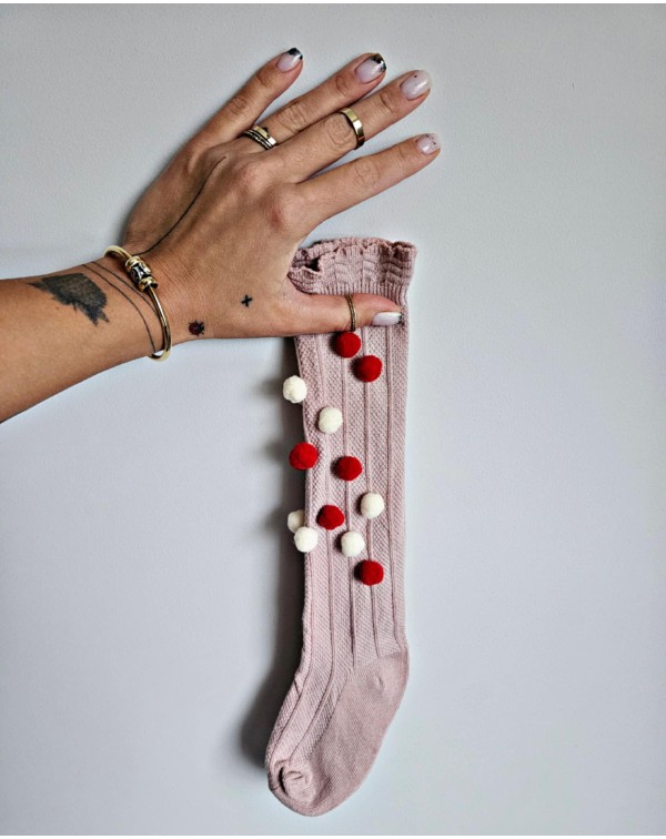 Rausvos kojinės iki kelių dekoruotos raudonais ir kreminiais pūkučiais