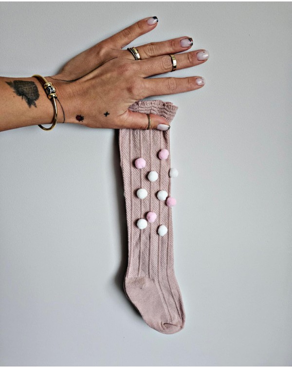 Rausvos kojinės iki kelių su dideliu rausvu ir įv. pasteliniais pūkučiais