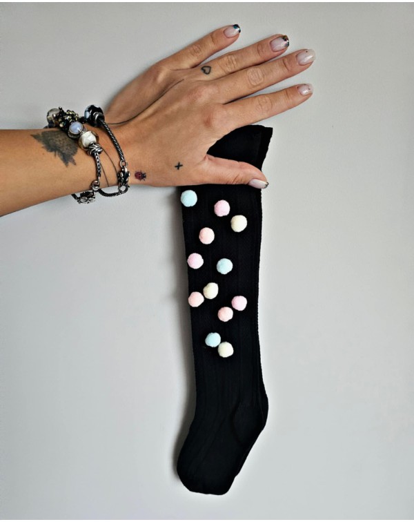Juodos kojinės iki kelių dekoruotos rausvais ir melsvais pūkučiais