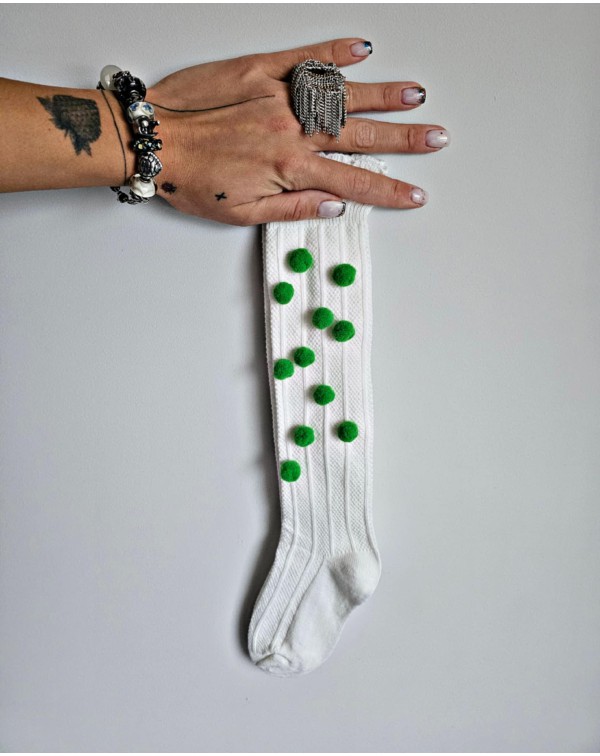 Baltos kojinės iki kelių dekoruotos žaliais pūkučiais