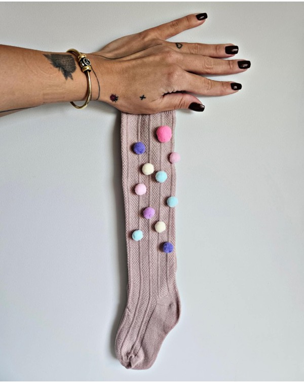 Rausvos kojinės iki kelių su dideliu rausvu ir įv. pasteliniais pūkučiais