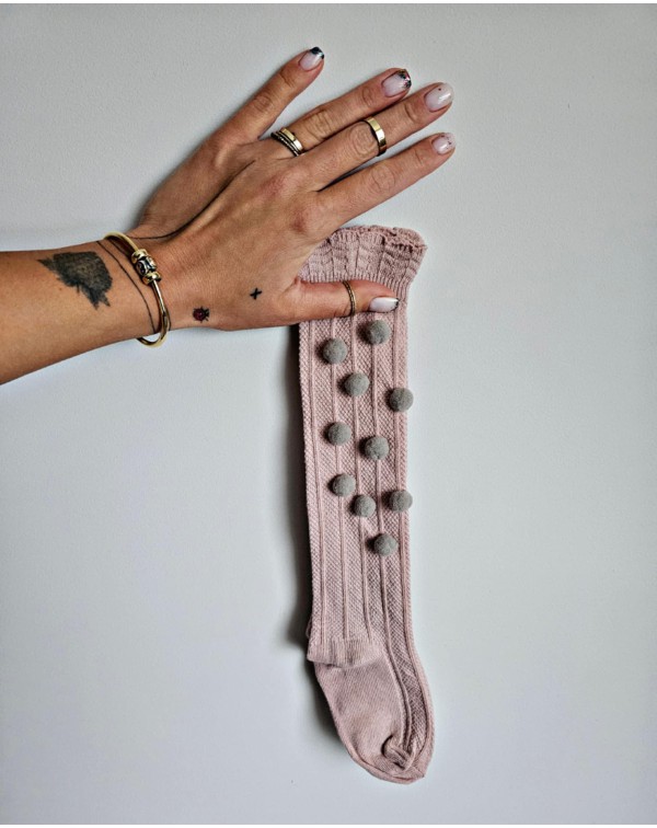 Rausvos kojinės iki kelių su dideliu rausvu ir įv. pasteliniais pūkučiais